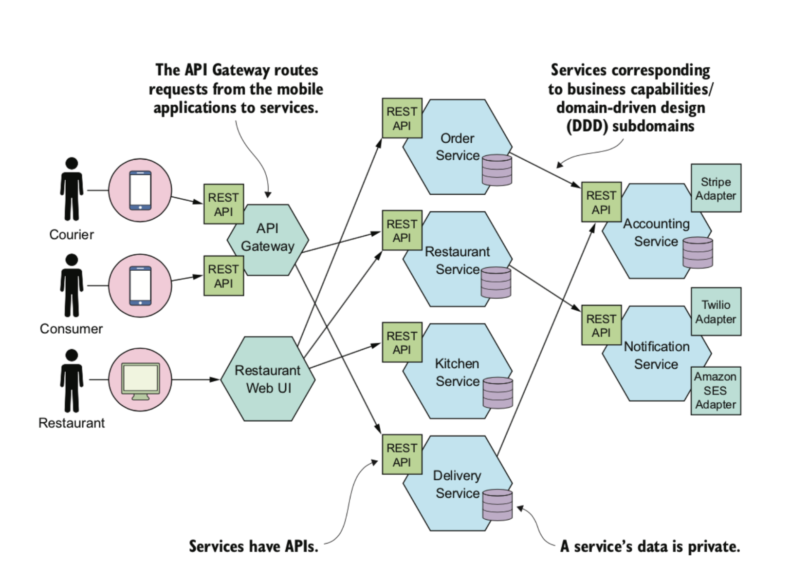 서비스는 단독 배포가 가능한 소프트웨어 컴포넌트이다. 클라이언트가 자신의 기능의 접근할 수 있도록 커맨트, 쿼리 , 이벤트로 구성된 API 를 제공한다. 이 서비스는 구현 상세가 캡슐화 되어 있어 API 를 통하지 않고 서비스에 접근 할수 없도록 모듈성이 보장된다.