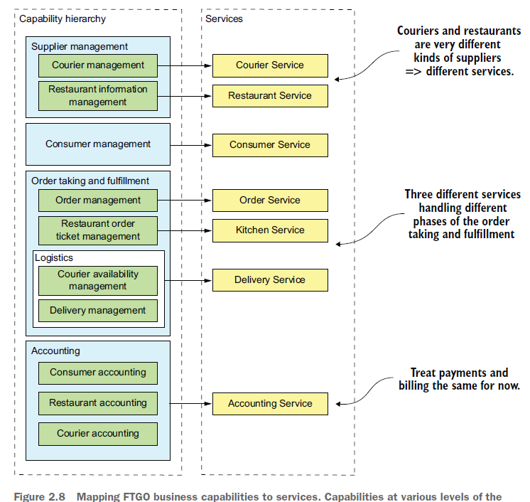 거의 변하지 않는 능력을 기준으로 서비스를 구성하면 비교적 안정적으로 아키텍처를 구축할 수 있다. 나중에 비지니스 요건이 달라져도 개별 컴포너트는 거의 변하지 않고 세부 비지니스만 발전 할 수 있다.