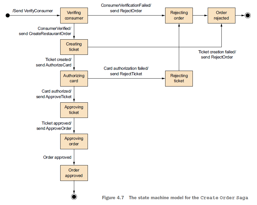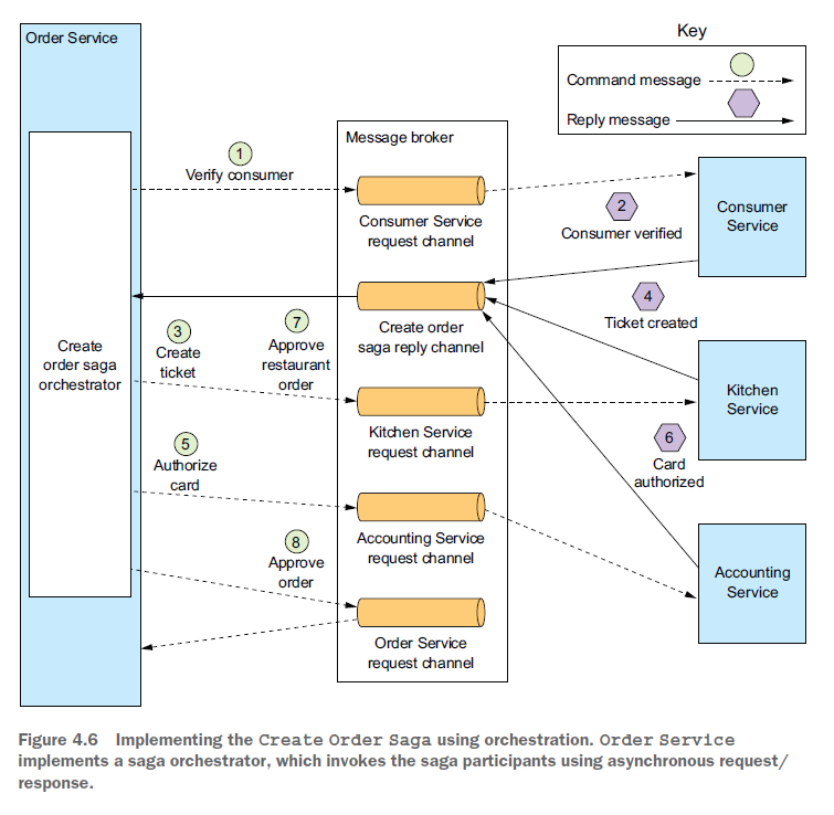 오케스트레이터인 Create order saga orchestrator 는 비동기 요청을 주고 받으며, 개별 서비스의 참여자를 호출 하고, 그 처리 결과에 따라 커맨드를 진행 한다.