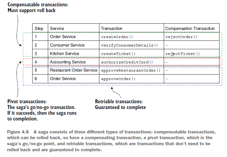 - 피봇 트랜잭션 : 사가의 진행/중단 지점. 피봇 트랜잭션이 커밋되면 사가는 완료될때까지 수행된다.