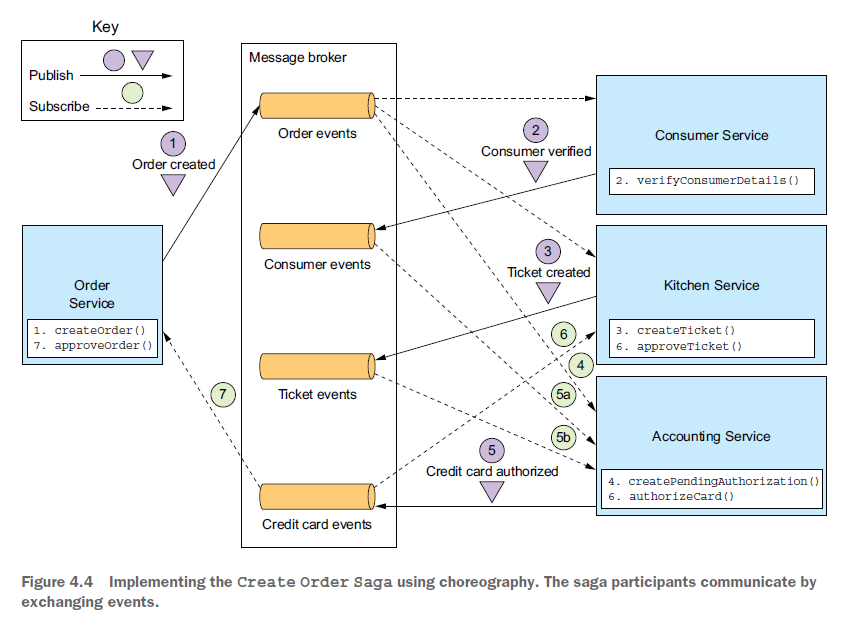 각 단계별로 로컬 트랜잭션이 완료되면 메시지를 발행해 다음 로컬 트랜잭션이 수행된다. 각 시스템 별로 느슨하게 결합되어야 하며, 다음 시스템이 중지된 상태면 메시지를 전달 받을때까지 대기 해야 한다.