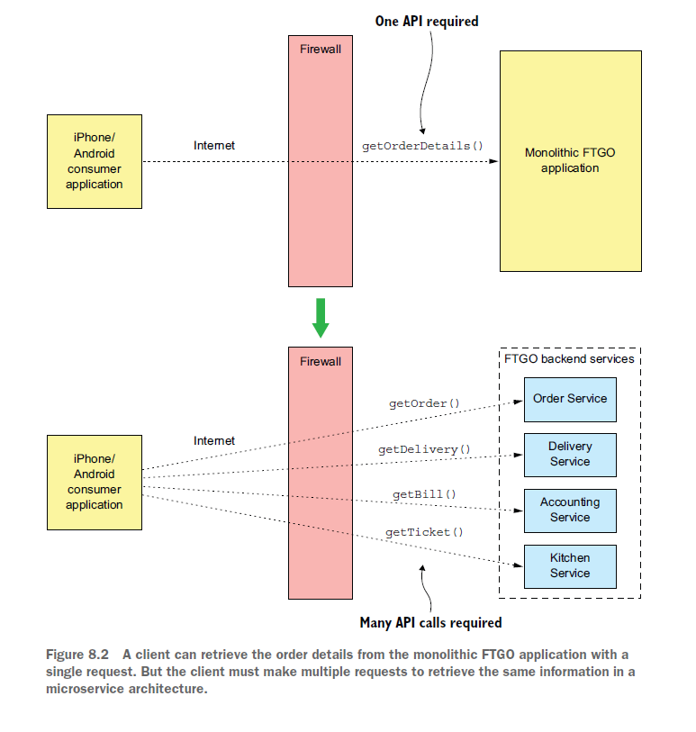 API 가 분리 되거나 합쳐질때, 클라이언트에 영향이 가게 된다. 모바일 앱의 경우, 배포가 자주 일어나지 않기떄문에 배포 업무에 제약 사항이 생길 수 밖에 없다.