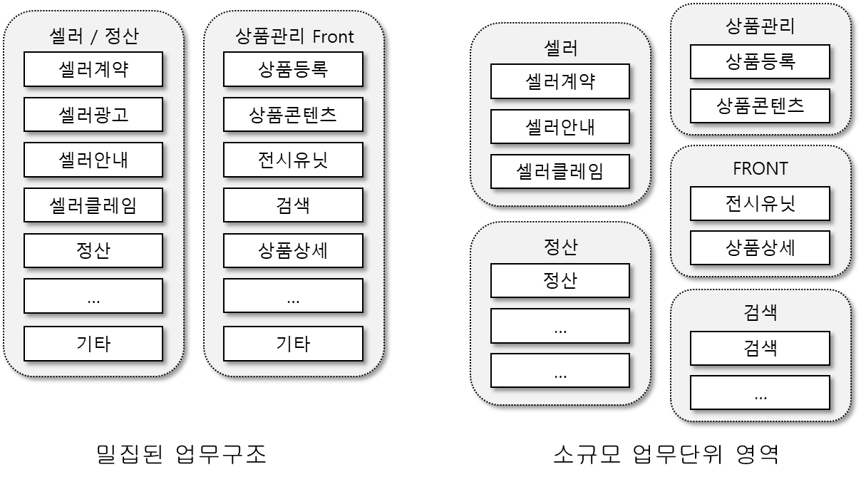 모놀리식 서비스는 업무간의 경계가 모호하고, 특정 영역은 다양한 업무를 한꺼번에 이루고 있는 경우가 많다. 때문에 특정 영역에 대한 집중도가 떨어질수 있으며, 업무 분석 범위가 넓기 때문에 많은 시간이 소요 된다.
