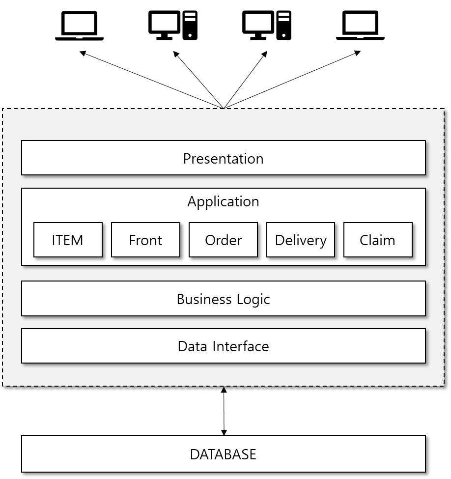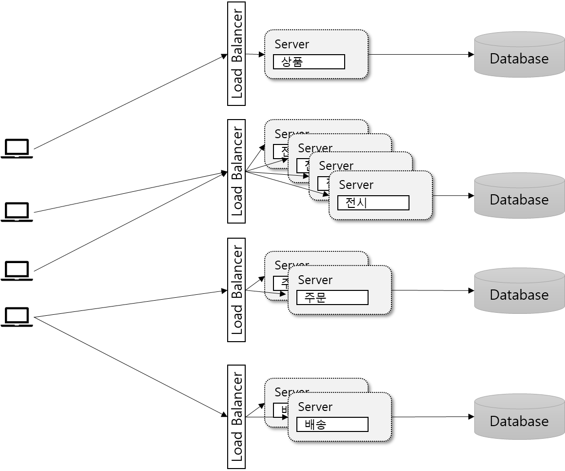 예를 들어, 상품등록, 주문, 배송에 대한 유입은 그대로인데, FRONT 인입만 늘어나는 상황이라면 FRONT 시스템만 SCALE-OUT 하면 된다. 또 주문영역도 주문영역내에서 주문내역 파일 다운로드 기능에 대한 요청이 늘어나면 해당 기능만 별도 시스템으로 구성해 SCALE-OUT 하면된다.