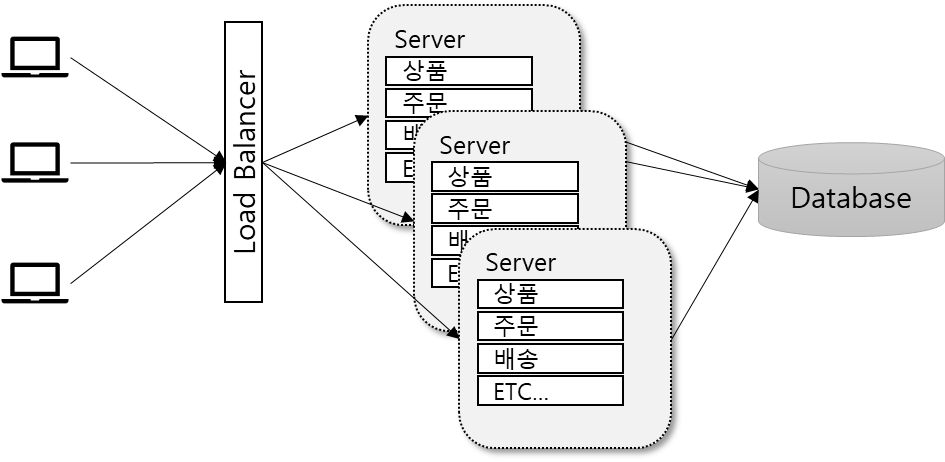 모놀리식 서비스는 일반적으로 거의 대부분의 시스템이 처음 개발 할때 선택하게 된다. 서비스 규모가 작고, 운영 인력이 작으며, 비용이 충분하지 않을 때 이 모놀리식 서비스 방식의 설계는 불가결하다.