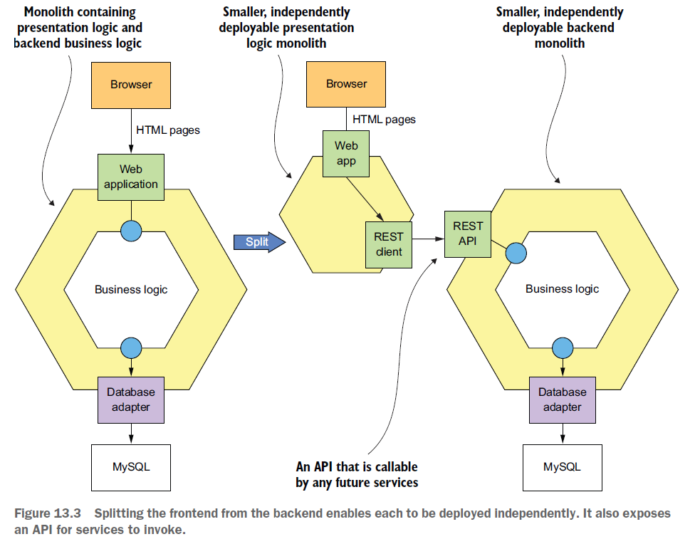 이렇게 나누면, 두 시스템이 독립적으로 개발, 배포될 수 있다. 또 나중에 개발 할 마이크로서비스가 호출 할 수 있는 원격 API 가 구분된다.