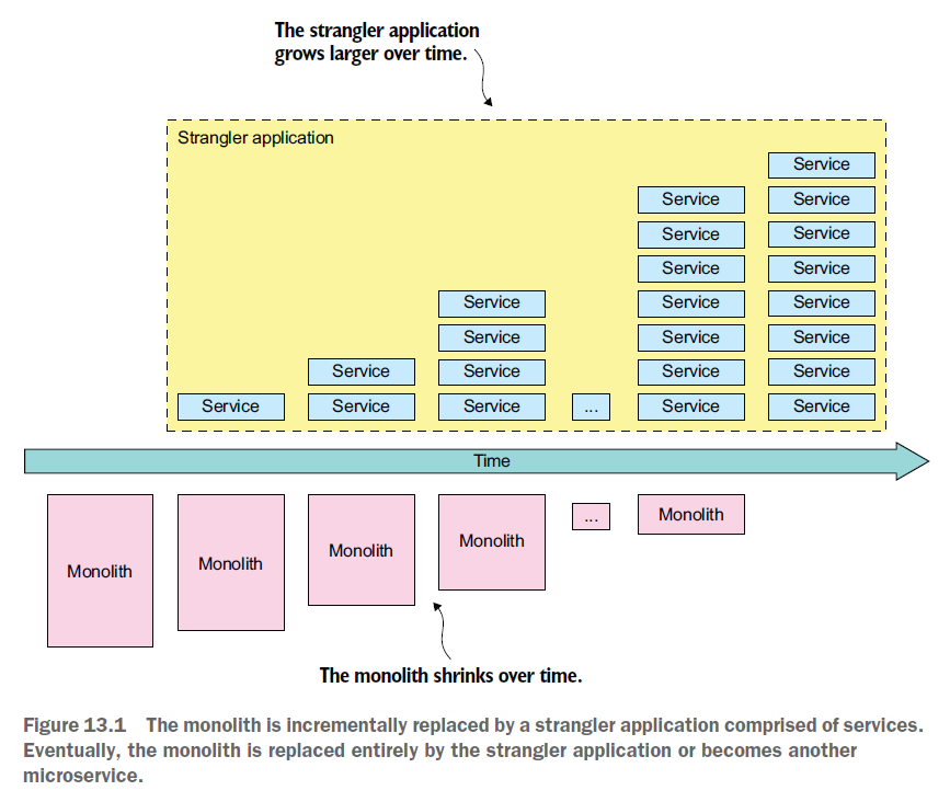 이 블로그는 마이크로서비스패턴 (길벗) 책 내용을 스터디를 위해 정리 한 내용 입니다. 책구매는 바로가기 에서 구매 가능합니다. "스트랭글러 애플리케이션(Strangler application), 모놀리스테어 서비스를 하나씩 추출해 마이크로 서비스에 새기능으로 구현, 스트랭글러 애플리케이션을 점점 키우며 모놀리스를 고사시킨다." 이번장에서는 마이크로서비스로의 리팩터링의 필요성, 스트랭글러 애플리케이션 개방 방법, 모놀리스와의 연계등 다양한 주제를 훑어 본다. 마이크로서비스 리팩터링 개요 마이크로서비스로의 리팩터링은 모놀리식이 형편 없어서 가 아니라, 모놀리식 지옥에 빠져 갖가지 소프트웨어 개발 문제가 발생하기 때문이다. 모놀리스를 왜 리팩터링 하는가? 마이크로서비스 아키텍처는 유지보수성, 테스트성, 확장..