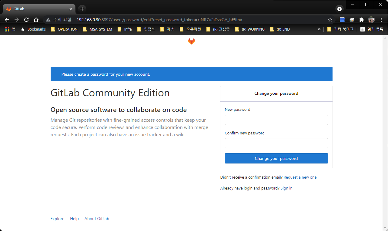 사전환경 CentOS 8 Docker CE DOCKER GITLAB 설치 gitlab 도커 이미지를 pull 받는다. Docker HUB 에서 CE 버젼은 (https://hub.docker.com/_/gitlab-community-edition) 이다. EE 버젼의 주소는 (https://hub.docker.com/_/gitlab-enterprise-edition) 이곳이다. CE와 EE는 라이센스 버젼 차이이며, EE 일경우에 30일 지나도 라이센스를 구매 하지 않으면 core 만 사용가능하며, 다른 기능은 이용 할 수 없다. 우리는 CE 를 설치 한다. docker pull store/gitlab/gitlab-ce:11.10.4-ce.0 설치를 확인하고, 다음 명령어로 실제 docker 를 수행한다..